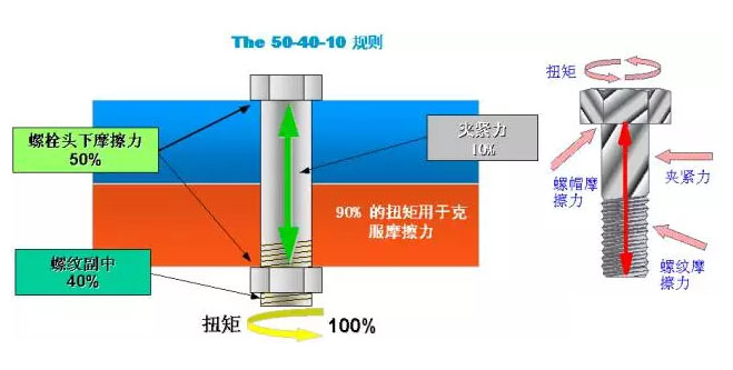 參見圖A:通常情況下,在螺栓的擰緊過(guò)程中,實(shí)際轉(zhuǎn)化為螺栓夾緊力的扭矩僅占10%,其余50%用于克服螺栓頭下的摩擦力,40%用于克服螺紋副中的摩擦力,這就是“541”規(guī)則,主要反映夾緊力與摩擦力之間的關(guān)系。但若施加一定的改善措施(如涂抹潤(rùn)滑油)或螺紋副中存有缺陷(如雜質(zhì)、磕碰等),該比例關(guān)系會(huì)受到不同影響而改變。